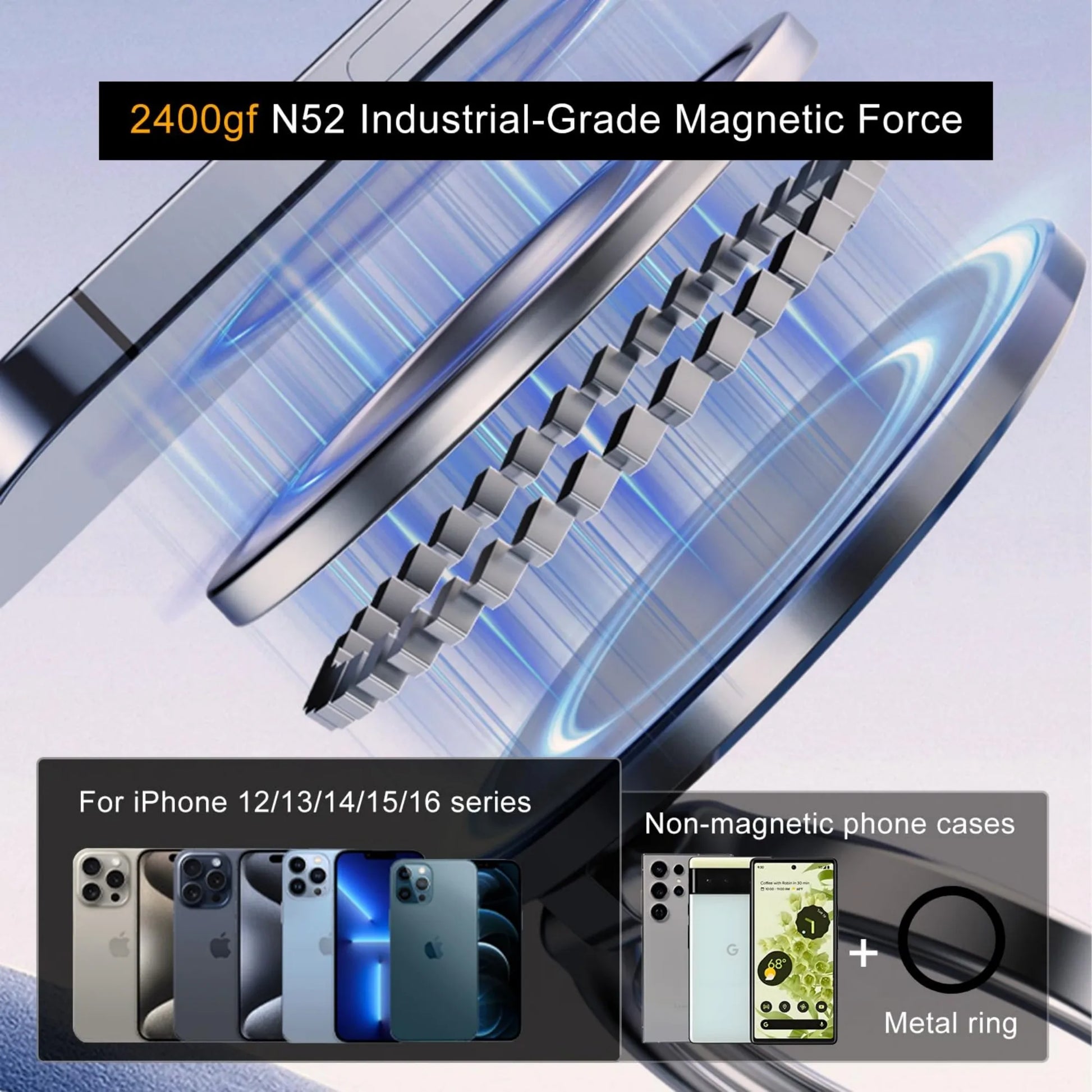 Force magnรฉtique puissanteย : รฉquipรฉ de 20ย ย aimants en nรฉodyme de qualitรฉ NS2ย ย disposรฉs en double anneau, garantissant que votre tรฉlรฉphone reste en place mรชme sous les vibrations !